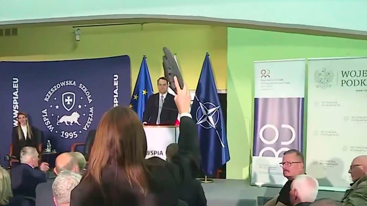 Пропалестинская активистка едва не сорвала выступление главы МИД Польши Радослава Сикорского, показав шлепанцы, якобы принадлежавшие жителю сектора Газа. Инцидент показали в эфире телеканала TVN24.