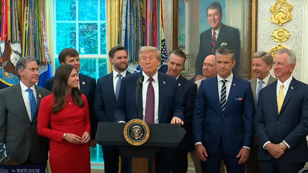 Американский лидер появился в кадре в окружении вице-президента, главы Пентагона и других федеральных министров.