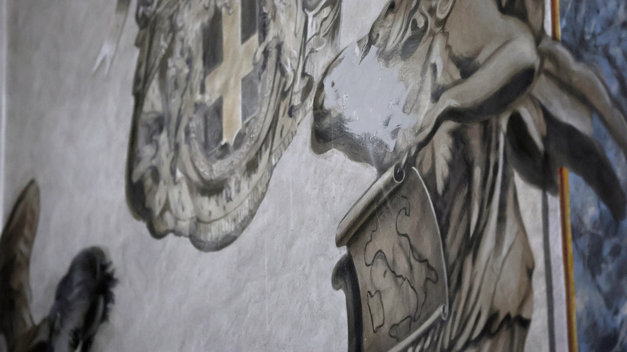 Непрофессиональный реставратор 83-летний Бруно Валентинетти отрицал, что рисовал Мелони. Однако косвенным подтверждением того, что это намек на премьера, служила сама композиция: два ангела окружают бюст последнего короля Умберто II Савойского. Он пробыл на троне лишь месяц после Второй мировой войны, до проведения референдума, упразднившего итальянскую монархию. Бюст установили по решению бывшего настоятеля церкви дона Пьетро Пинтуса, монархиста. Это произошло в 1985 году, спустя два года после смерти короля в изгнании. В 2000 году бюст окружили ангелы. В руках одного из них, которого все сравнивали с Мелони, свиток с изображением Италии.
