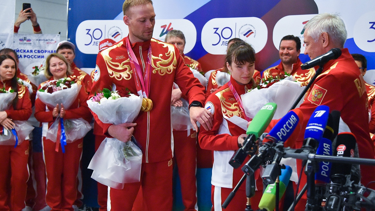Спортсмены из России заработали рекордное количество золотых медалей на человека - команда из шести человек взяли восемь высших наград. После возвращения атлеты исполнили российский гимн вместе с болельщиками.