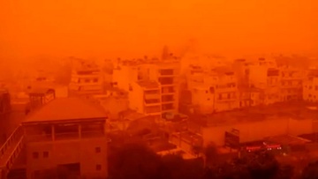 На Крите пыльная буря из Сахары окрасила небо в красно-оранжевый цвет